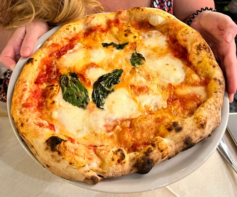 Neapolitan pizza arrives wet and floppy from fresh tomatoes and mozzarella. Eating with a knife and fork is completely acceptable and common. Rolling it like a crepe also works. Don’t expect crispy crust – that’s not Neapolitan style. The pizza might look burnt in spots – that’s the char from 900°F ovens and is desirable.